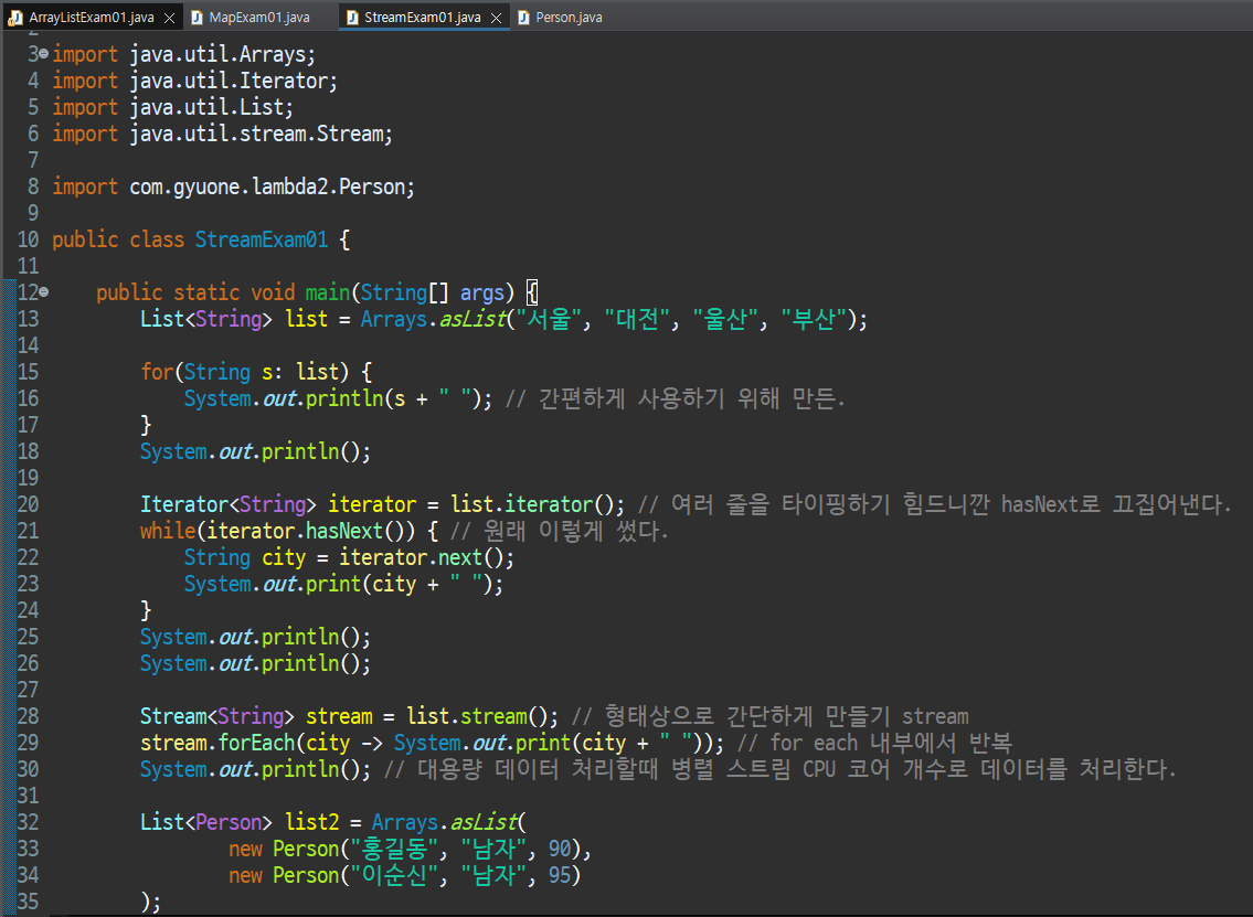 Stream<String> stream = list.stream(); // ννμμΌλ‘ κ°λ¨νκ² λ§λ€κΈ° stream