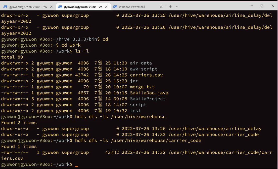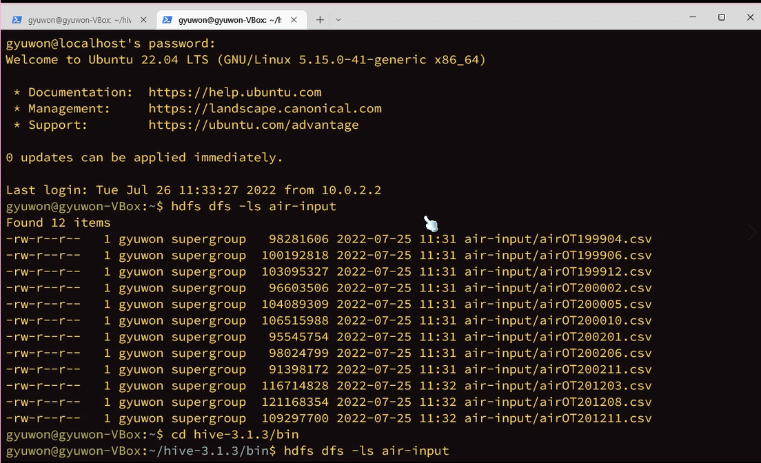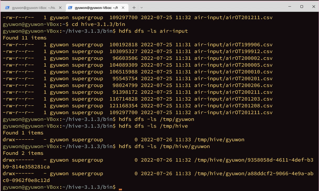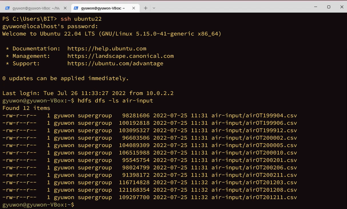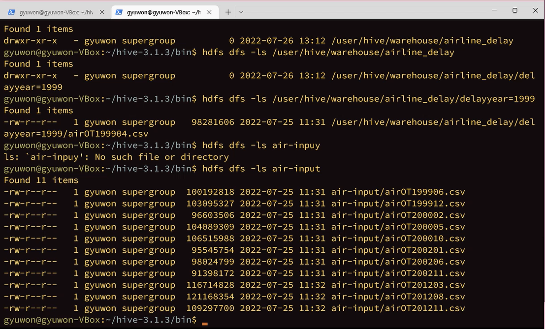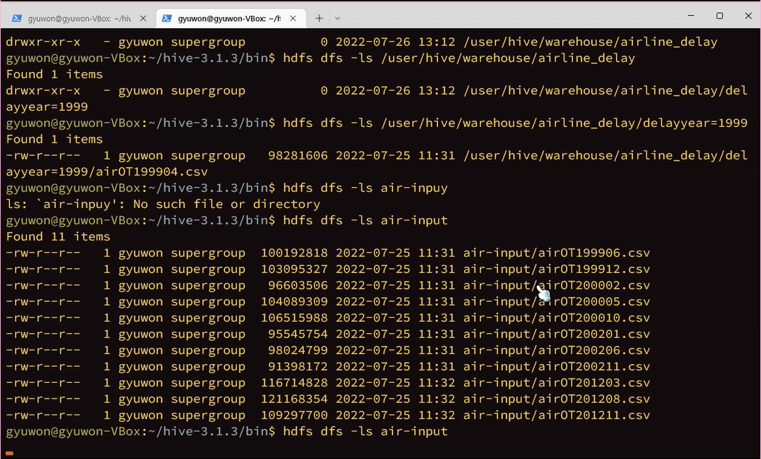 hdfs dfs -ls air-input ๋ฐ์ดํฐ ์ฌ์ฉ