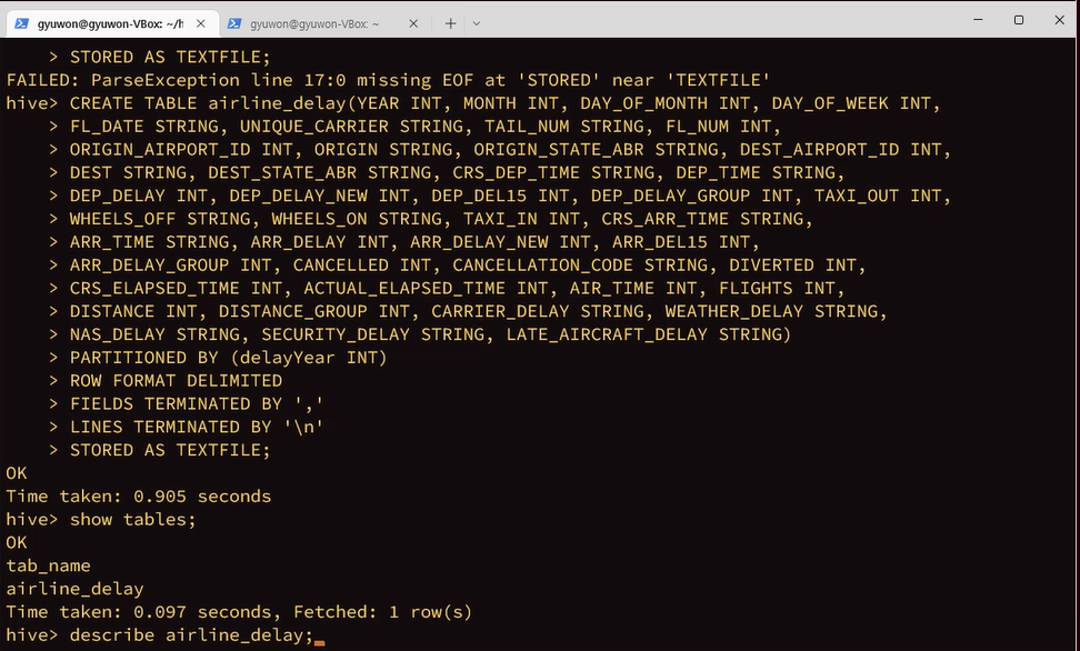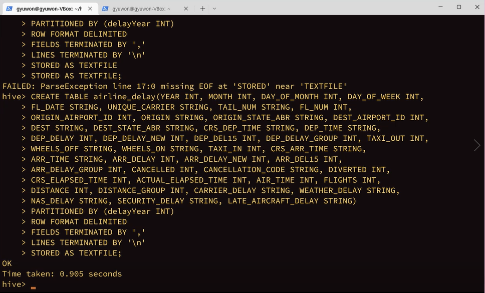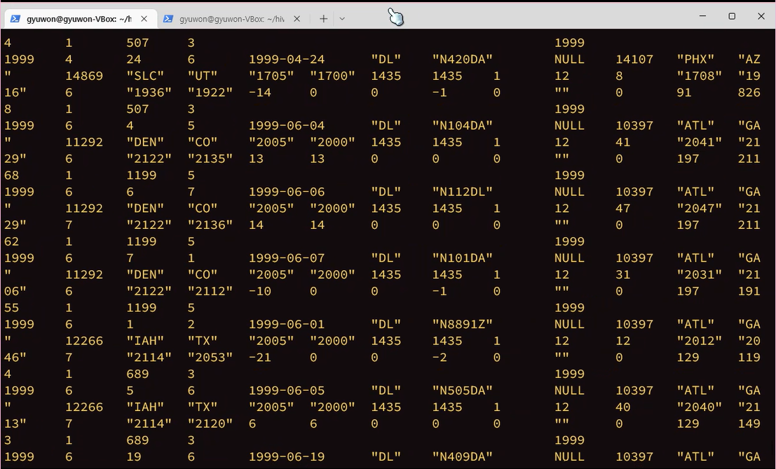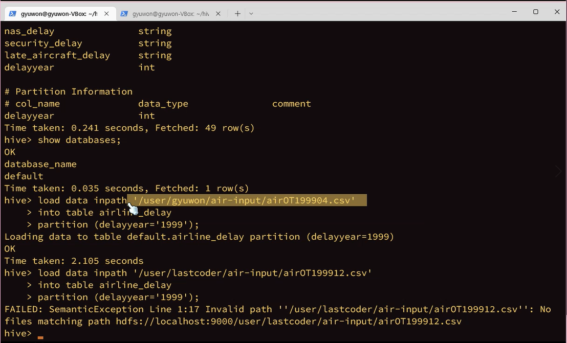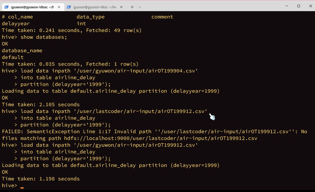 load data inpath '/user/gyuwon/air-input/airOT199904.csv'