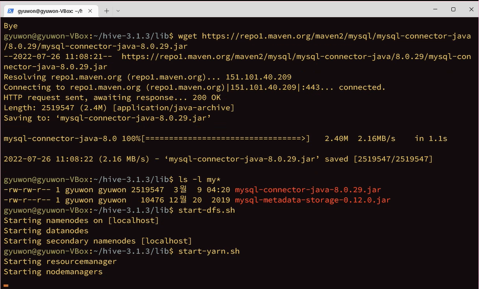 wget https://dlcdn.apache.org/hive/hive-3.1.3/apache-hive-3.1.3-bin.tar.gz ์ค์น