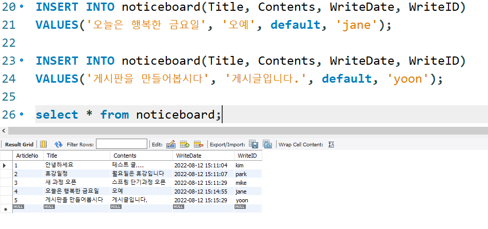 insert into noticeboard (Title, Contents, WriteDate, WriteID)