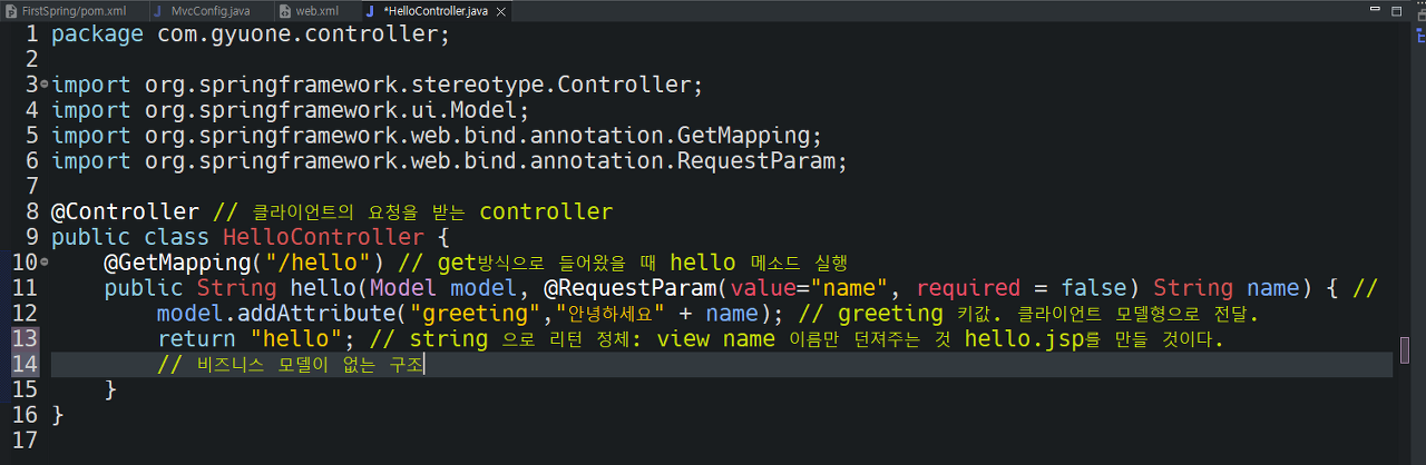 return "hello"; // string 으로 리턴 정체: view name 이름만 던져주는 것 hello.jsp를 만들 것이다.