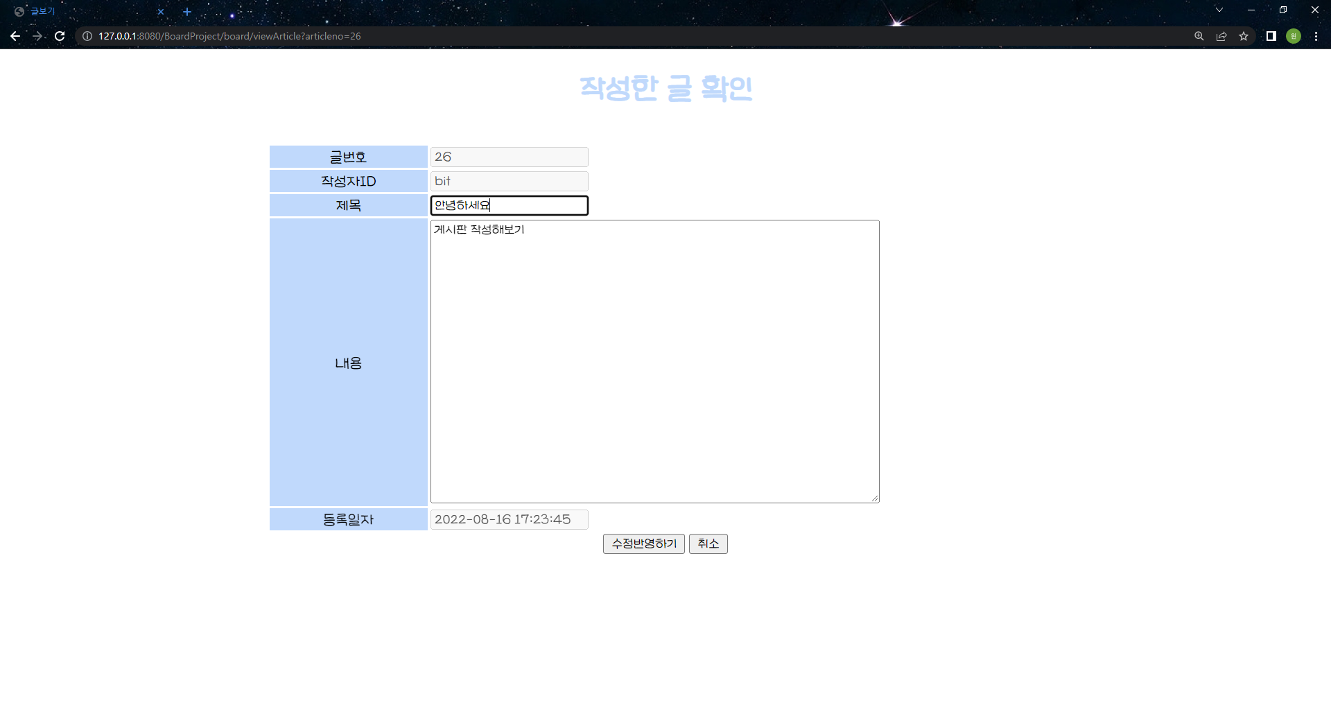 | [40일차] 게시판 만들기(3) delete. update 추가 🌀 최종 게시판 만들기 (0) | 2022.08.17 |