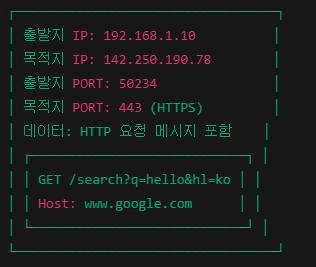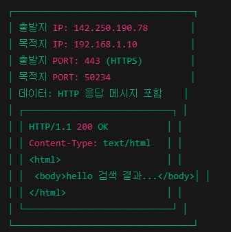 1️⃣ 브라우저에서 "hello" 검색 2️⃣ DNS 조회 → 구글 IP 확인 3️⃣ HTTP 요청 메시지 생성 후 TCP/IP 패킷으로 전달 4️⃣ 구글 서버가 요청을 처리하고 응답 패킷 생성 5️⃣ 웹 브라우저가 응답을 받아 HTML을 렌더링 6️⃣ 사용자가 검색 결과를 확인